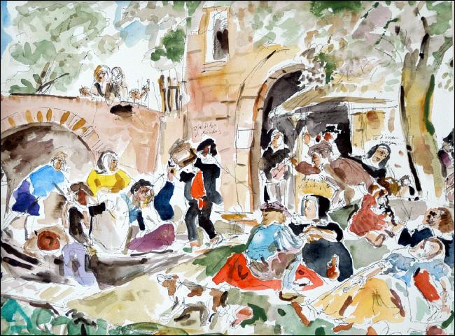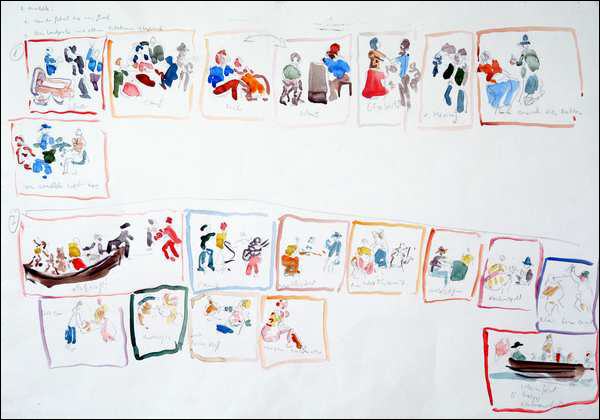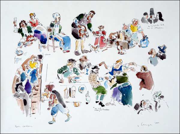 ![]() Im Inneren des Wirtshauses ( Szenen nach Steen), Feder, Aquarell, 60 x 70 cm, 2000 |