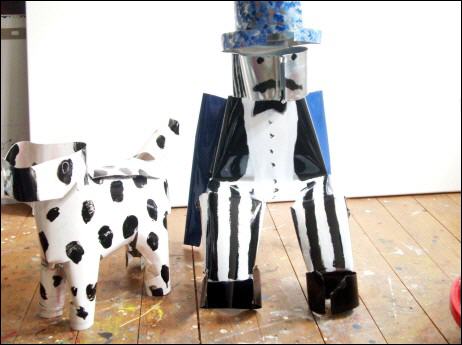 Blechfiguren haben nur eine geringe Masse und fordern dadurch zu spezifischen Leistungen heraus um auch nur annähernd die Bedingungen der Rund-um- Plastik zu erfüllen. Aufregend wird es wenn ein zweidimensional vorgegebenes Motiv in eine Blechskulptur verwandelt wird. Jetzt kreuzen sich figürlich- körperliche Mimesis und die formalen Gesetze des Plastischen. Die bunte Lackierung muss dann beide Aspekte respektieren. In den ersten drei Steen-Projekten näherten wir uns dem jeweiligen Bild auf möglichst vielfältige Weise an. Hier ist die Auseinandersetzung auf die Umsetzung von Steens Bild- Personen in die Blechfiguren reduziert. Dadurch kommt es verstärkt zu vom Original abweichenden Interpretationen der Figuren. Das Grundverfahren ist bei allen meinen Blech- Skulpturen dasselbe. Ausgangspunkt ist immer das Rechteck. Durch intensive körperliche Vorstellung wird die ganze Blechfigur unverdeckt und von allen Seiten sichtbar vorgestellt. Es gibt keine Skizze und auch keine Zeichnung auf dem Blech. In diesem Überwinden einer Dimension in Richtung auf die nächste steckt nicht nur eine Herausforderung , sondern auch eine große Lust. Mit jedem Schritt muss die Biegung, Drehung, Faltung, Kantung der entstehenden Flächen bedacht werden. Schnitt für Schnitt baut sich so die Figur auf. Nicht unwesentlich ist das Problem des freien Stehens der Figuren. Bei diesem Verfahren Figuren des Vorbildes ohne Zwischenschritte unmittelbar in Blech umzusetzen, ist eine Tendenz zur Befreiung der Figur von der Vorlage offenbar zwingend. Die Konzentration verschiebt sich auf plastische Probleme und später beim Lackieren auf farbige Antworten auf die sphärischen, glatten oder kantigen Flächen. Im Sinne unseres Drei –Schritt- Modells von RE-,De-, Konstruktion ist das der direkte Weg zur Konstruktion neuer Figuren. |