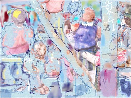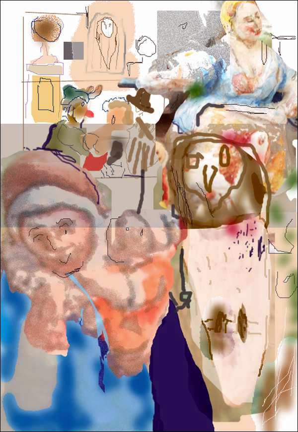 Die Versuche die Digitalaufnahmen des Modells im Photoshop weiter zu bearbeiten, stießen die Tür zu neuen Bild- Dimensionen auf. Der fotografierte Ausschnitt gab Form und Struktur vor.Farben, Strukturen und Kontraste wurden geändert; behutsame zeichnerische Eingriffe liessen annähernd gegenstandslose Bilder entstehen. Das galt besonders für die Bilder, die aus ungewöhnlichen Perspektiven („Luftaufnahme“) entwickelt wurden. Ein anderer Weg war das elektronische Ausschneiden von Details aus verschiedenen Bildern und ihr Zusammenfügen in einem neuen Bild. Auch hier entstehen durch zusätzliche zeichnerische Eingriffe, Farb- und Strukturveränderungen völlig neue Bilder. |