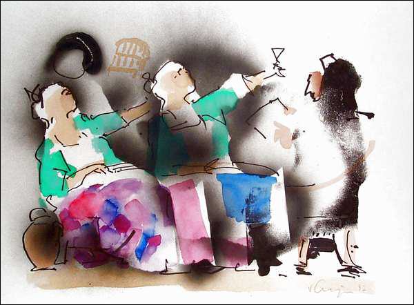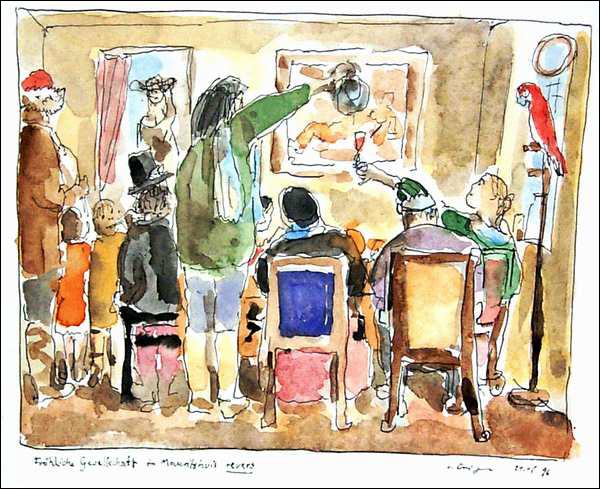 ![]() Fröhliche Gesellschaft "revers", Feder, Tusche, Aquarell, 29 x 32 cm, 1996 |