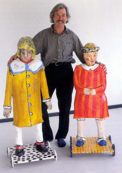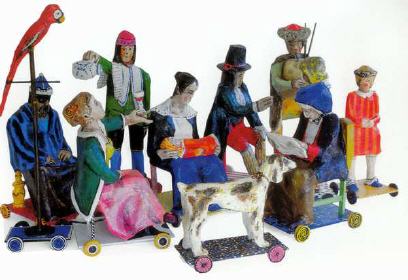 Das Angebot, das ganze Projekt in der renommierten Tübinger Kunsthalle auszustellen, weckte die Vorstellung alle Figuren des Bildes als Großplastiken auf Räder zu stellen und so dem Besucher die Möglichkeit zu bieten, die Szene umzustellen. Als Material des Untergestells dienten Dachlatten, die verleimt und auf eine Bodenplatte montiert wurden. Darüber wurde die Figur annähernd lebensgroß mit Maschendraht ( Hasen-/Kaninchendraht) modelliert. Darüber gekleistertes Zeitungspapier und schließlich eine Haut aus Leinenstücken, die in Kunstharz getränkt wurden. Auf eine weiße Grundierung wurde mit Acrylfarben gemalt. Als Achsen dienten lange Schrauben mit denen die Holzscheiben- Räder an der Grundplatte befestigt wurden.